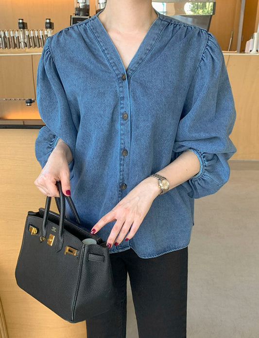 Sale프릴 퍼프 데님 블라우스