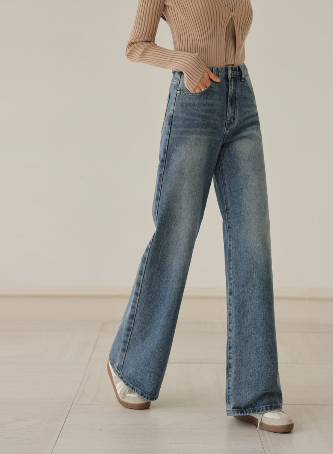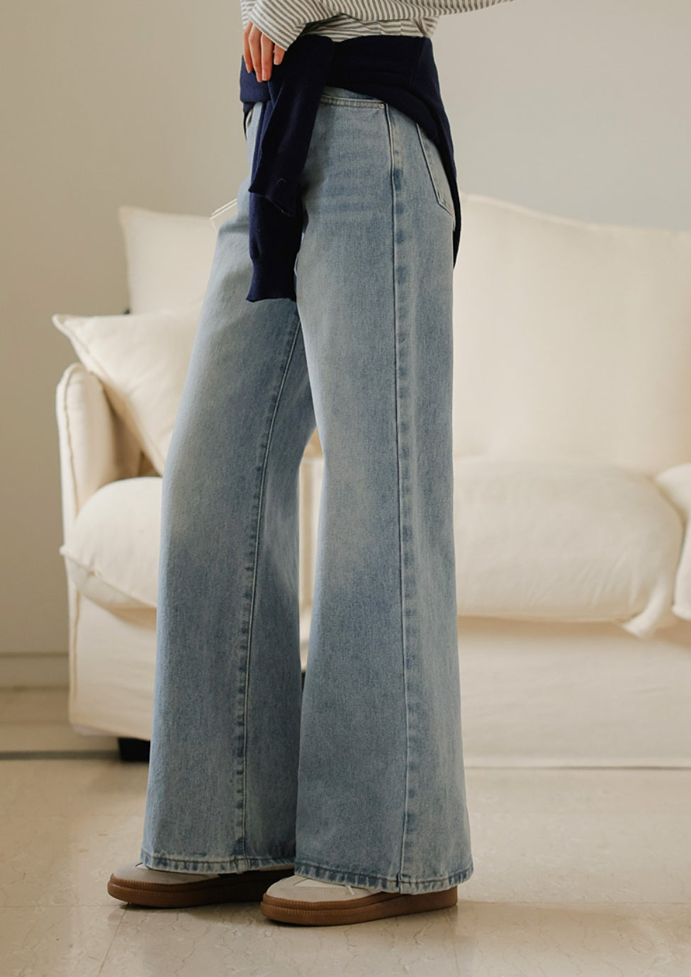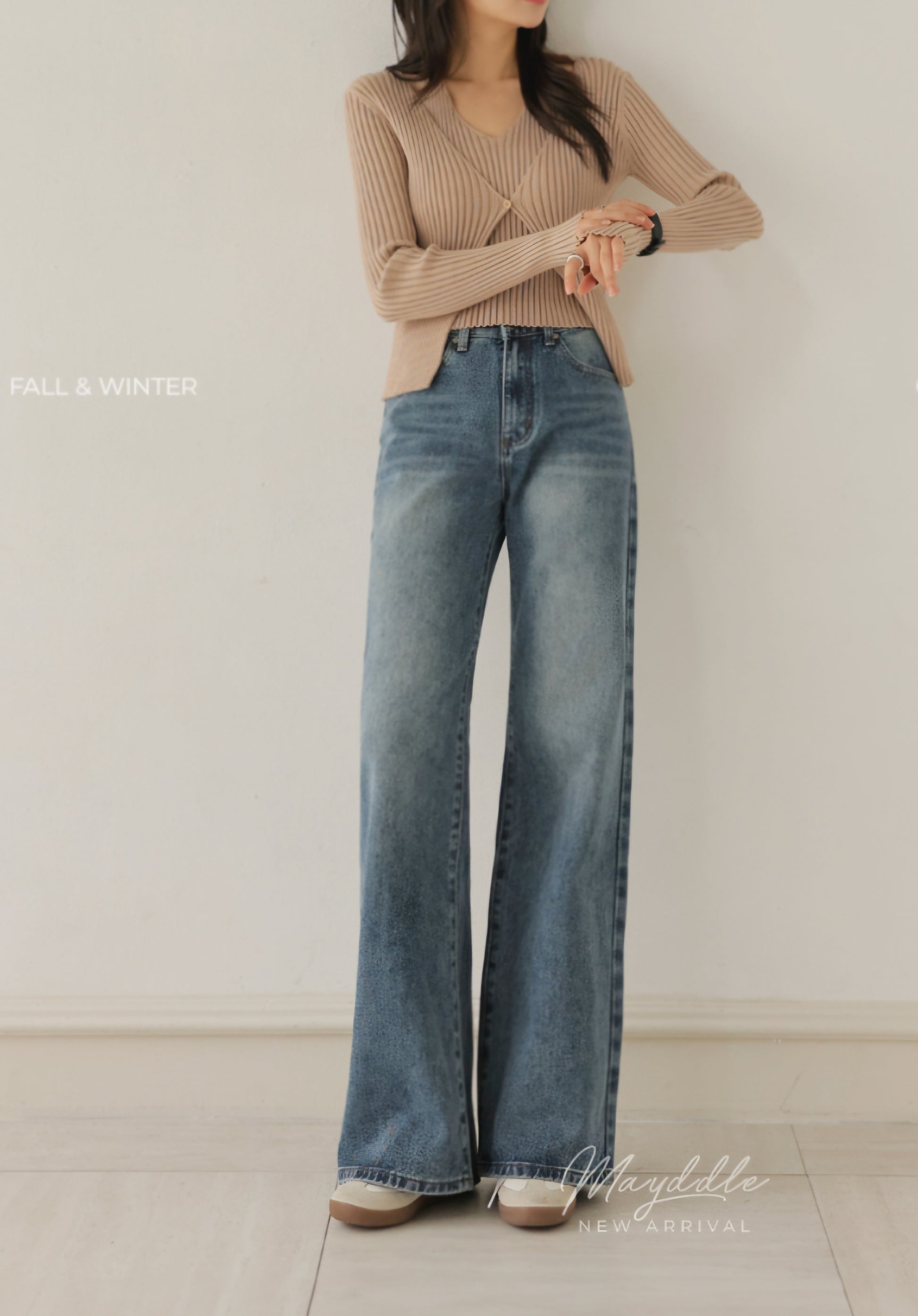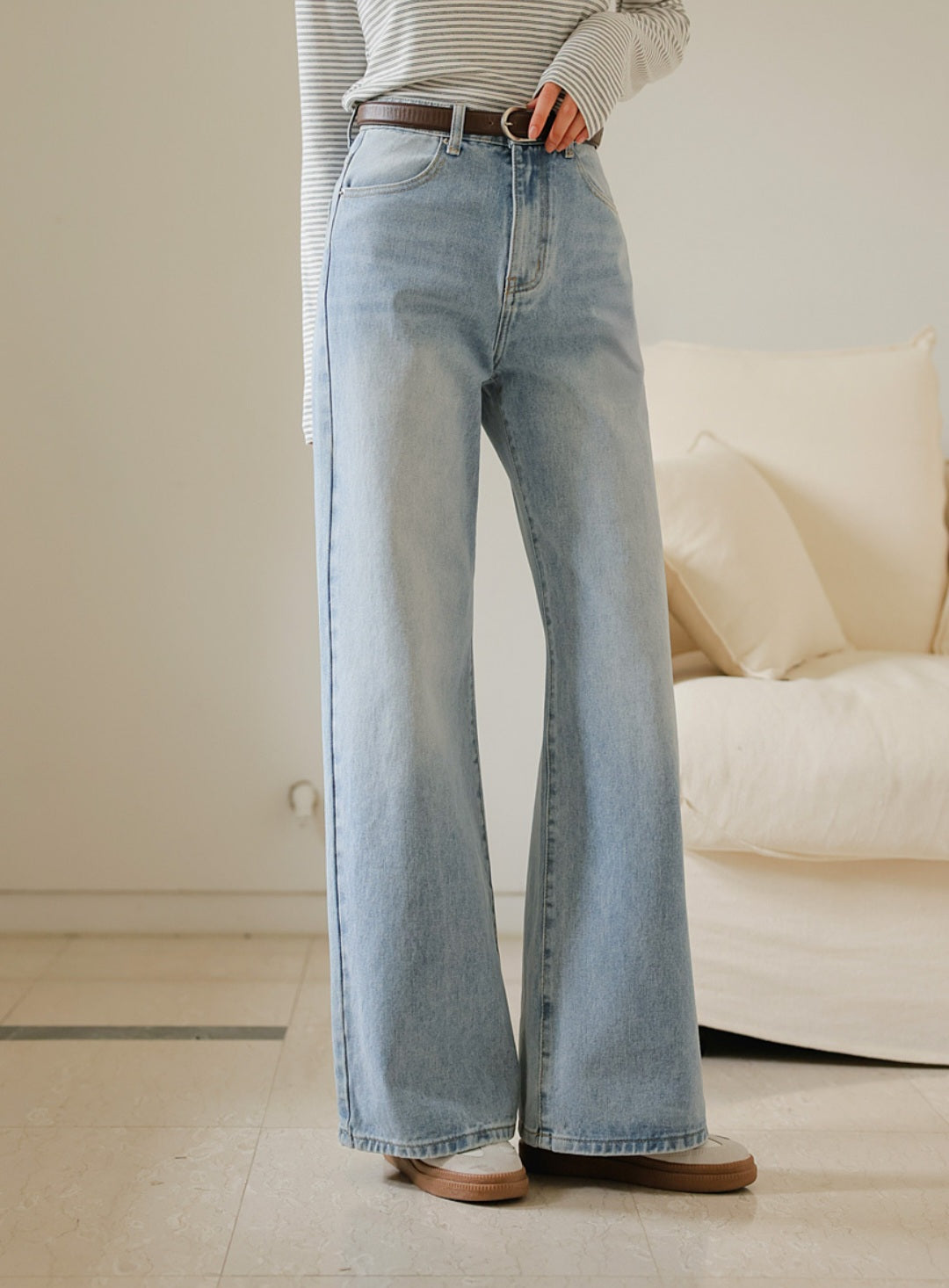 자연스럽게 커버해 주는 와이드 부츠컷 실루엣이에요.
