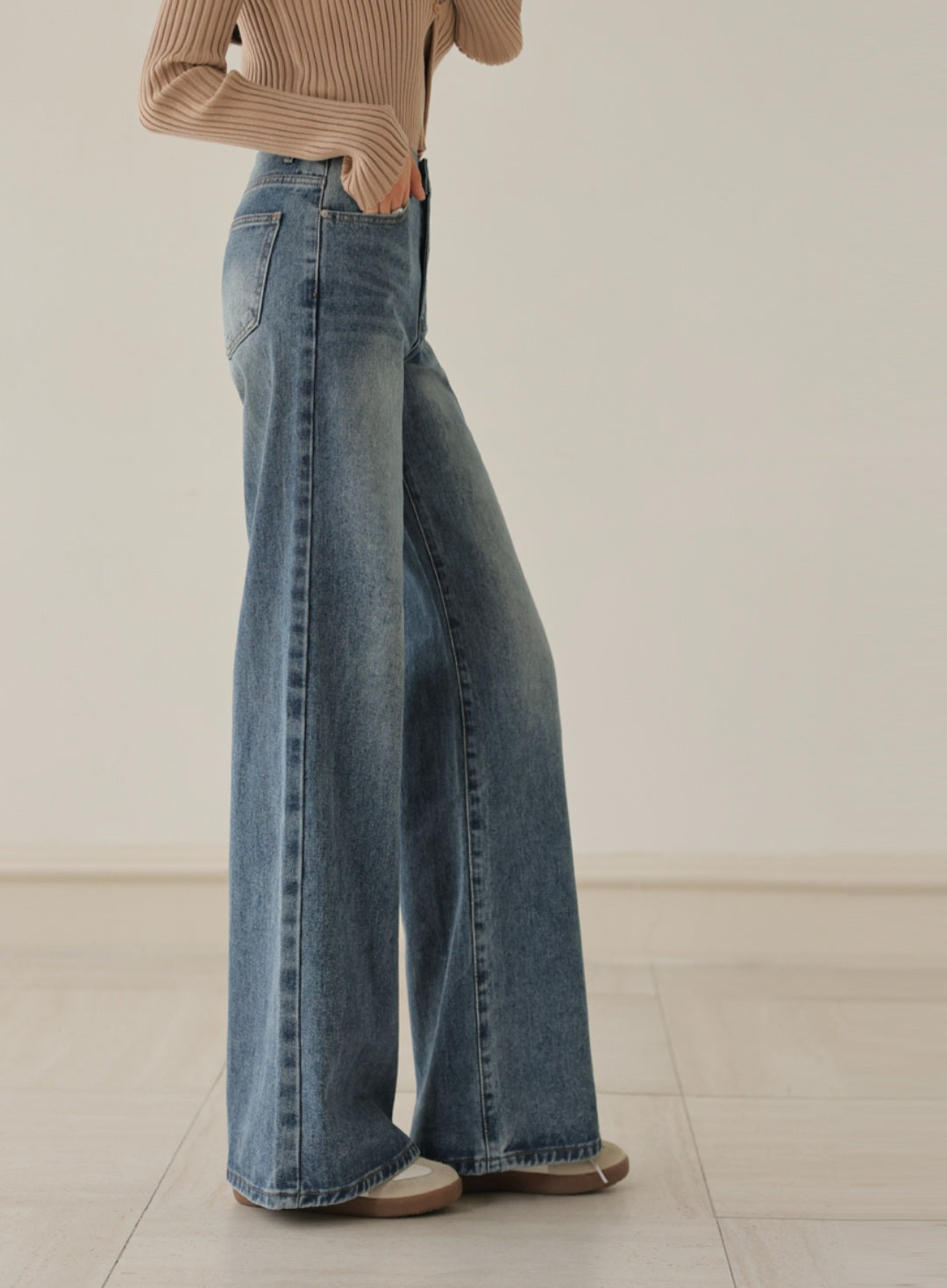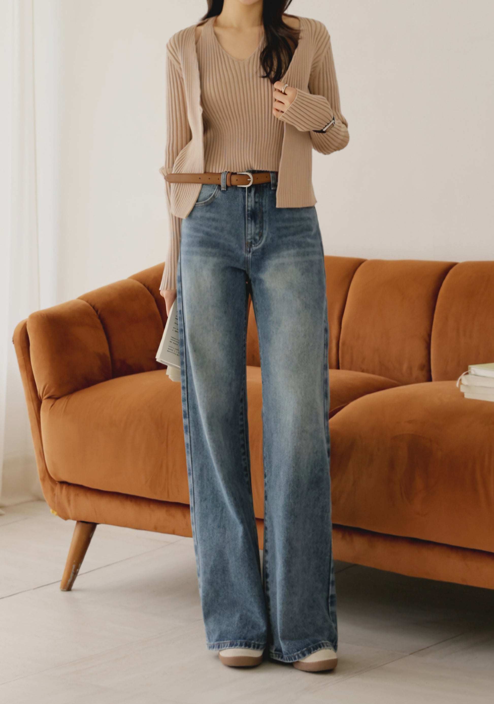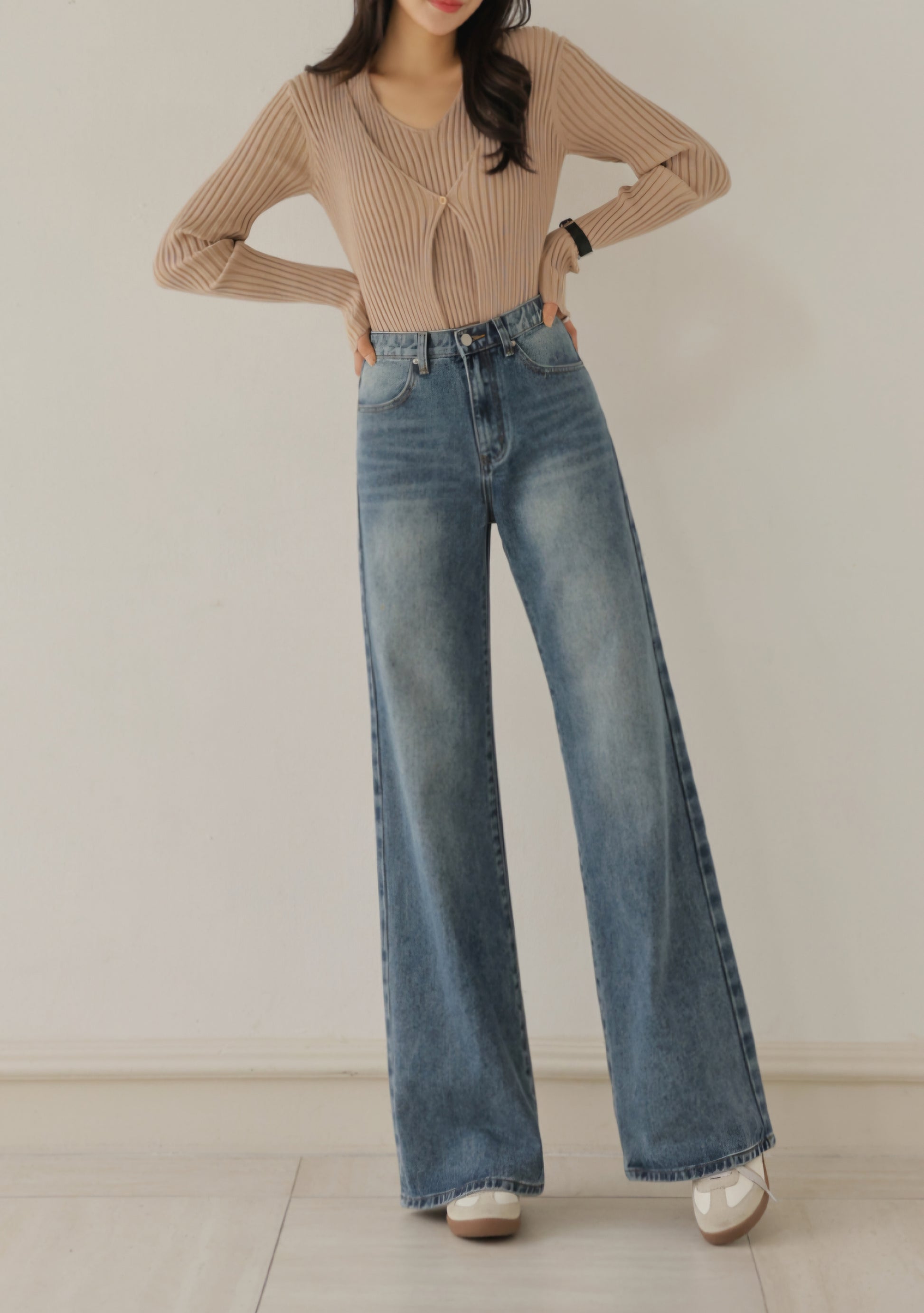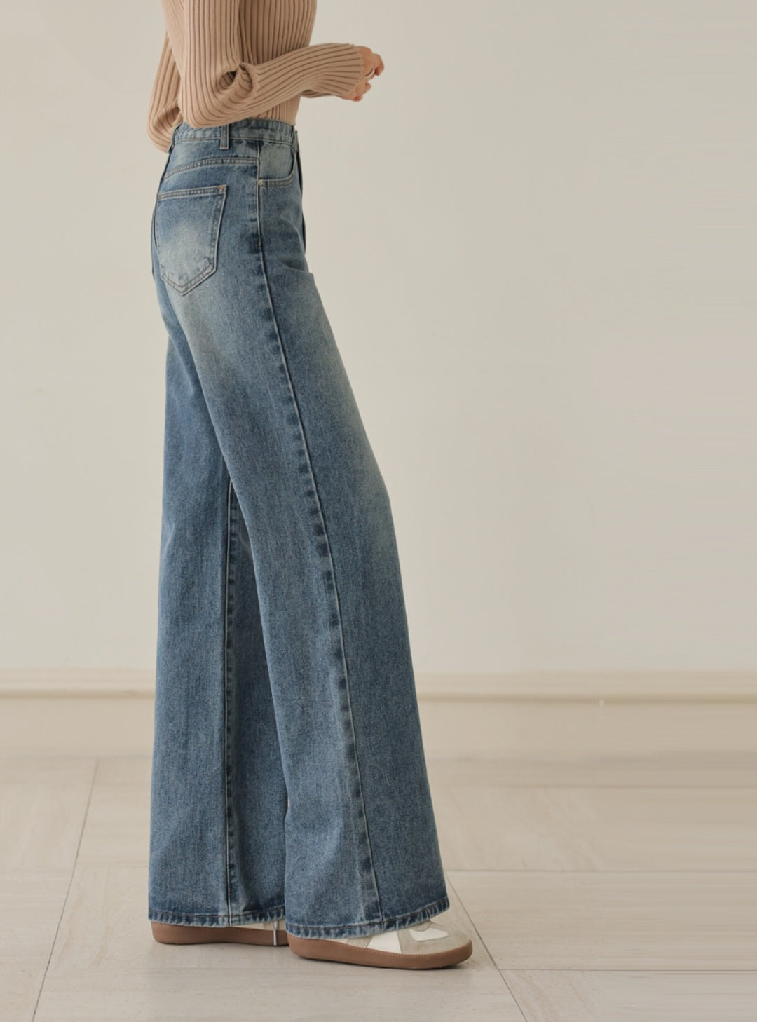 자연스럽게 커버해 주는 와이드 부츠컷 실루엣이에요.