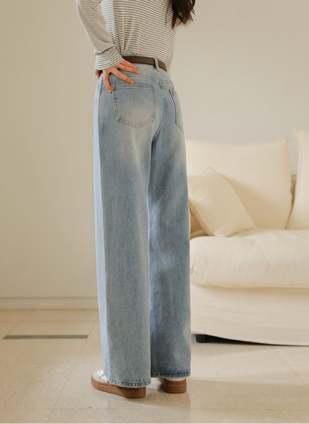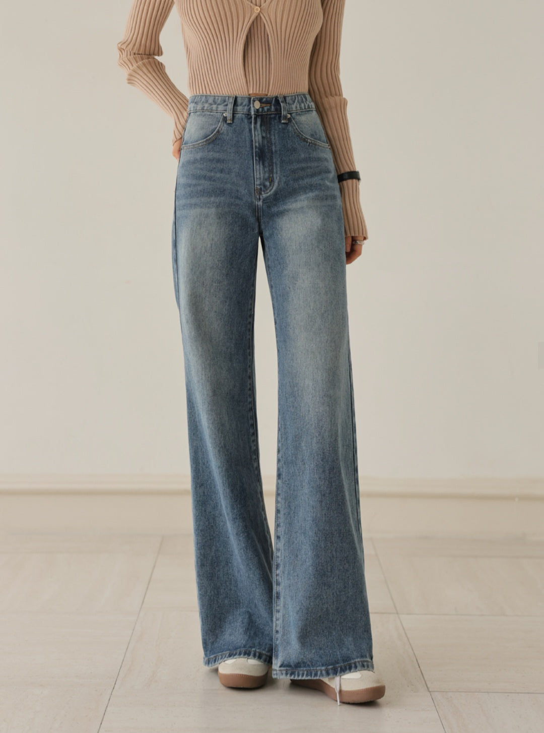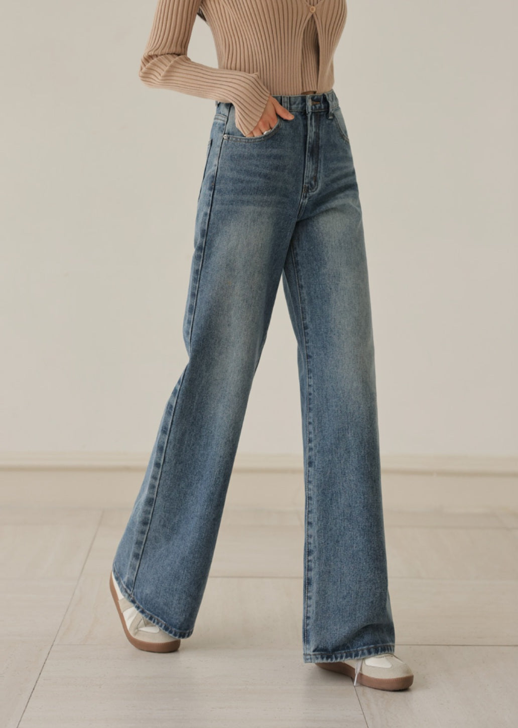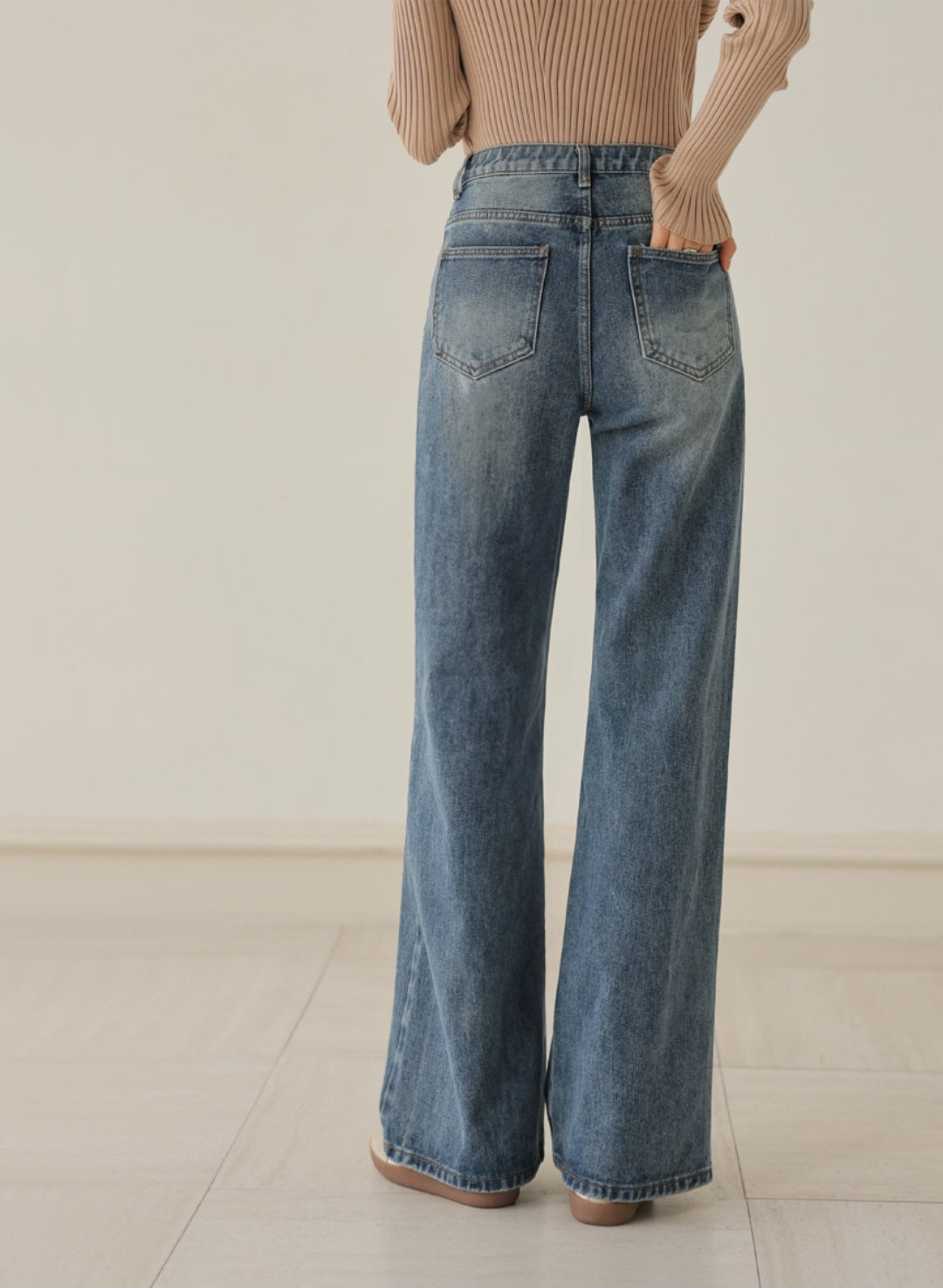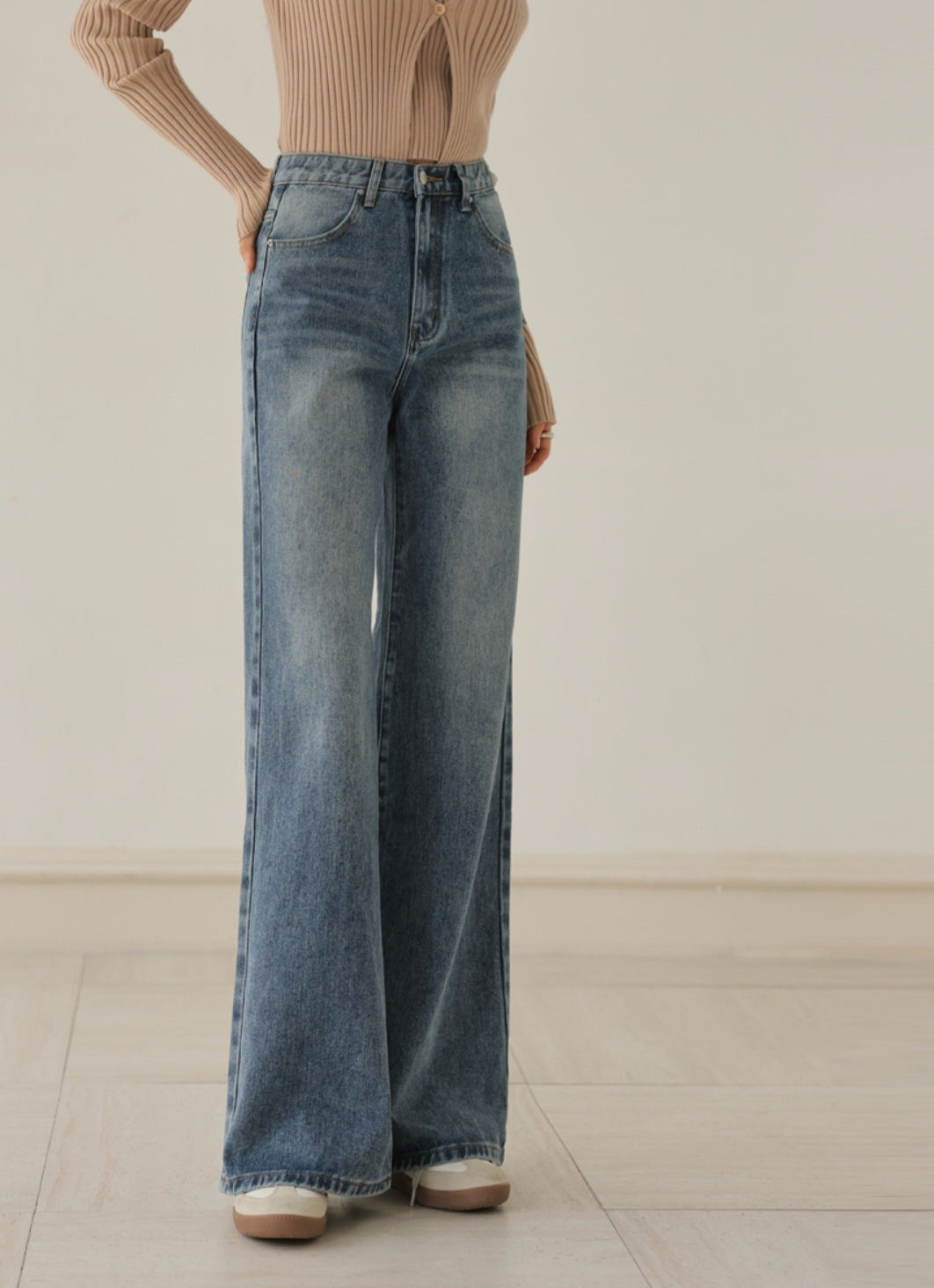 자연스럽게 커버해 주는 와이드 부츠컷 실루엣이에요.