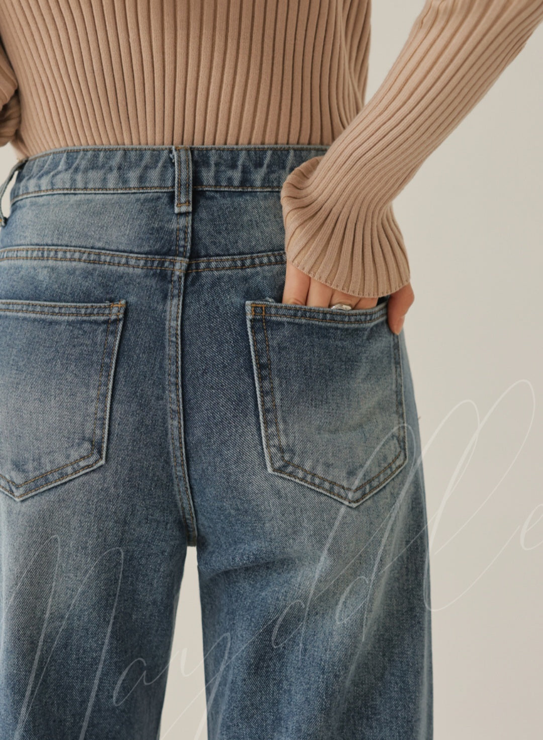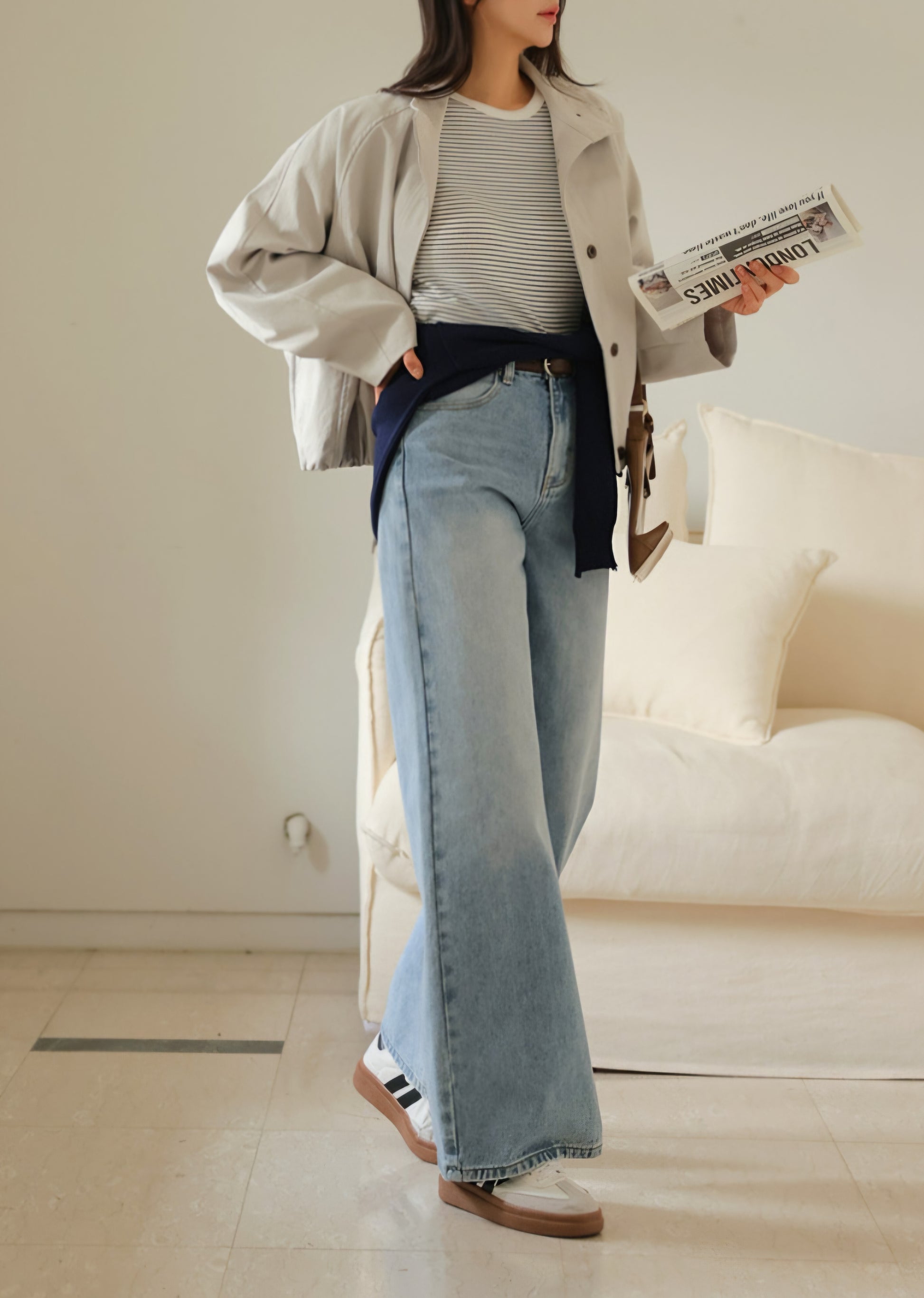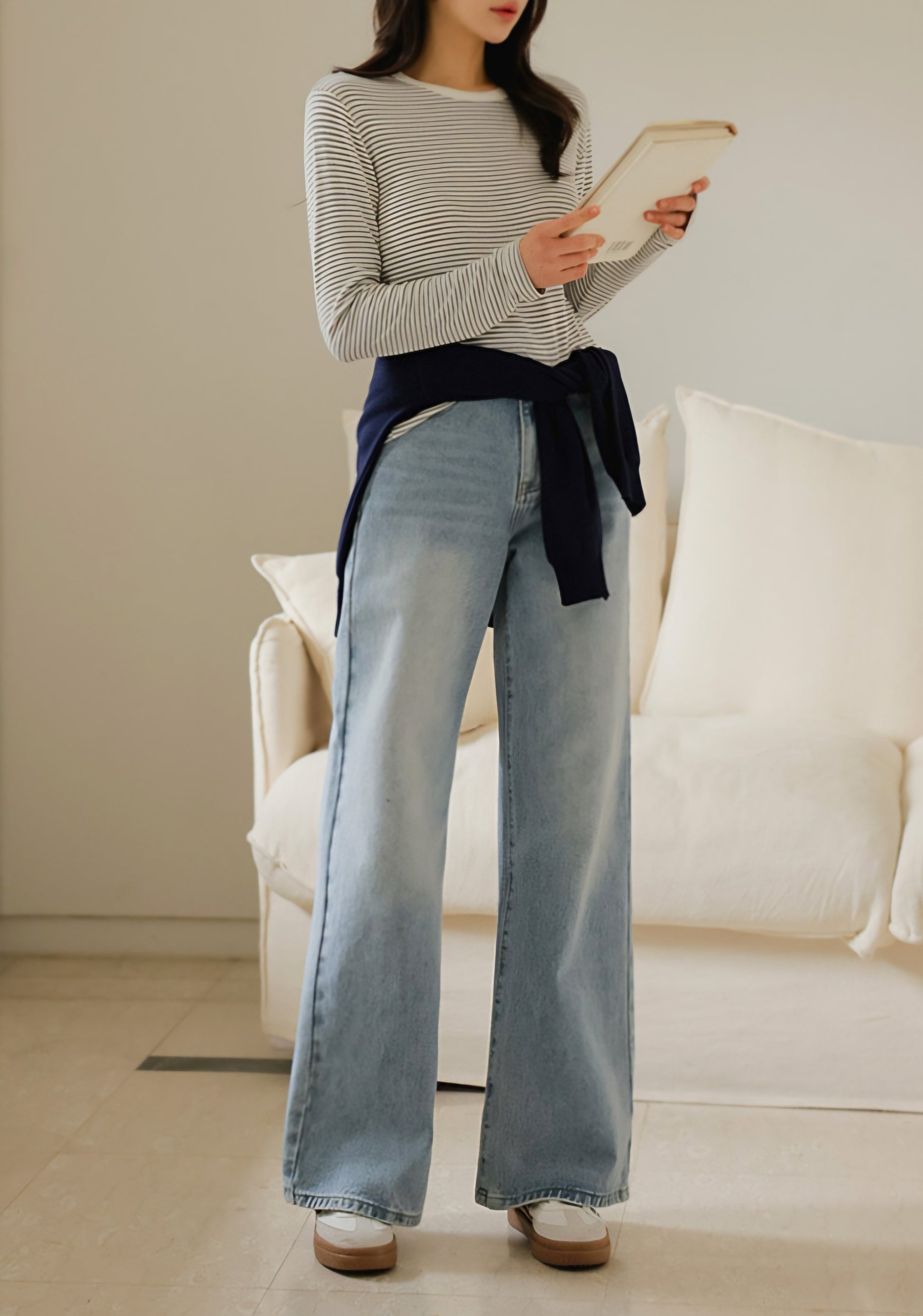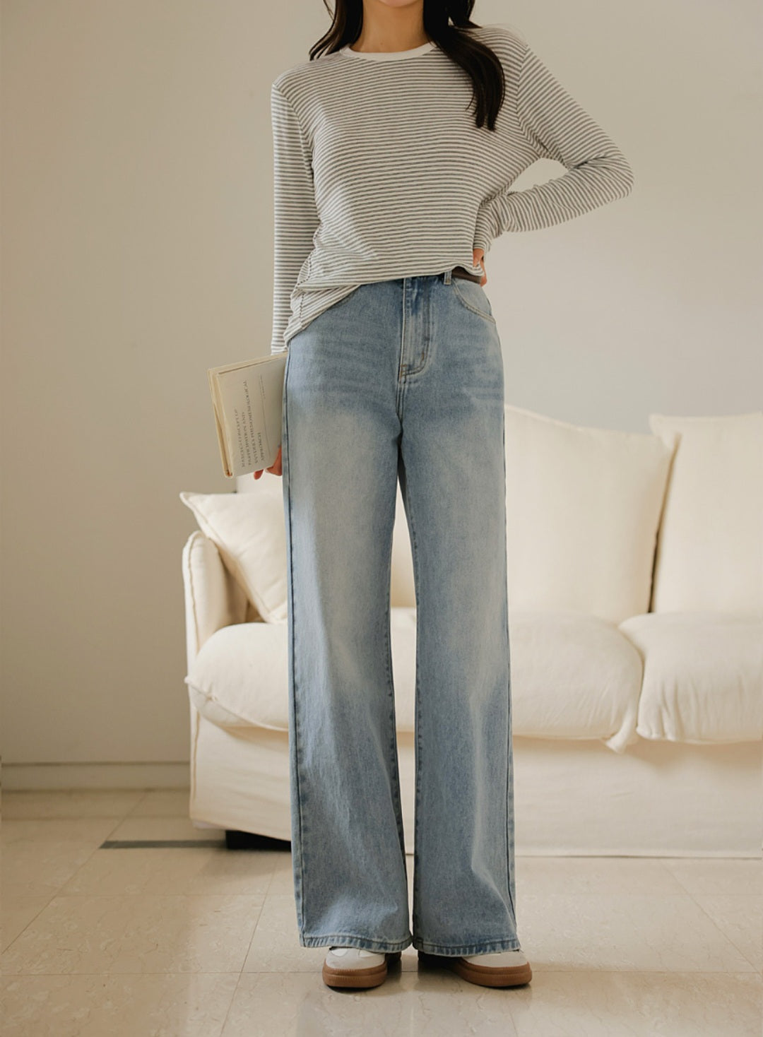 자연스럽게 커버해 주는 와이드 부츠컷 실루엣이에요.